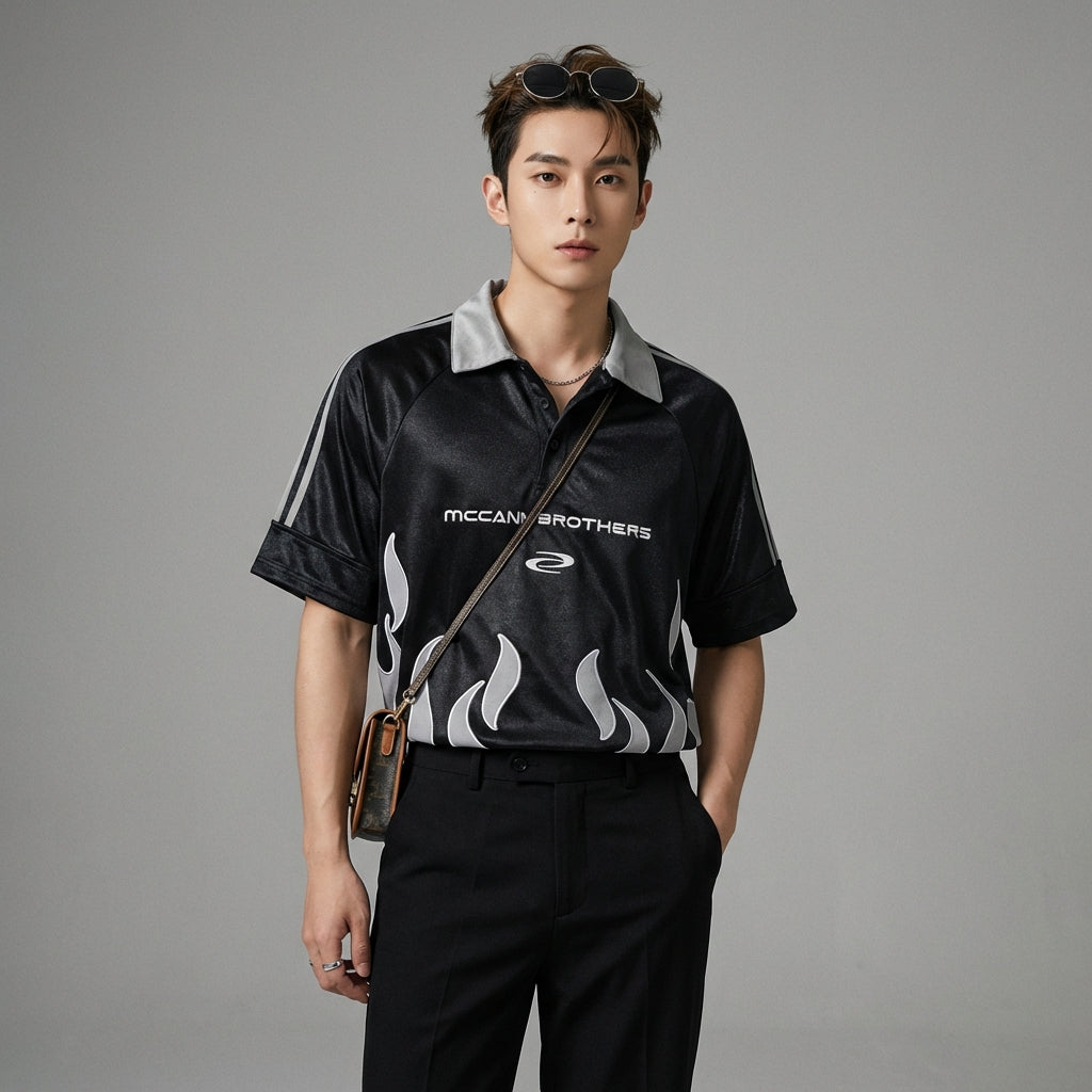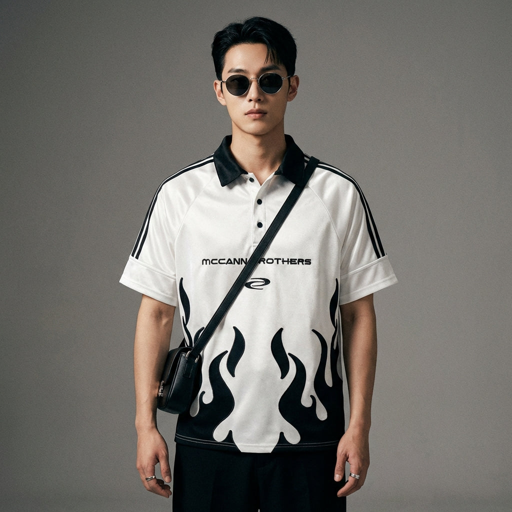 Betonen Sie Ihren Stil mit unserem Oversize-Poloshirt im gewagten Flammen-Design. Perfekt für einen lässigen und trendigen Streetwear-Look, verleiht dieses Kurzarm-T-Shirt mit Polokragen Ihrer Sommergarderobe einen Hauch von Originalität! 🔥