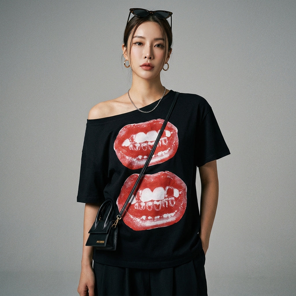 Betonen Sie Ihren Stil mit unserem Oversize-T-Shirt mit auffälligem Lippenprint. Sein asymmetrischer und lässiger Schnitt macht es zum perfekten Teil für einen selbstbewussten und trendigen Streetwear-Look! 💋