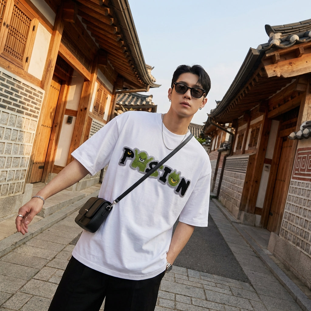 - Stil: Streetwear, K-Fashion, Japanisch Retro. Dieses T-Shirt verkörpert den lässigen und stilvollen Geist der koreanischen Mode, perfekt für einen kühnen und zeitgenössischen Look.