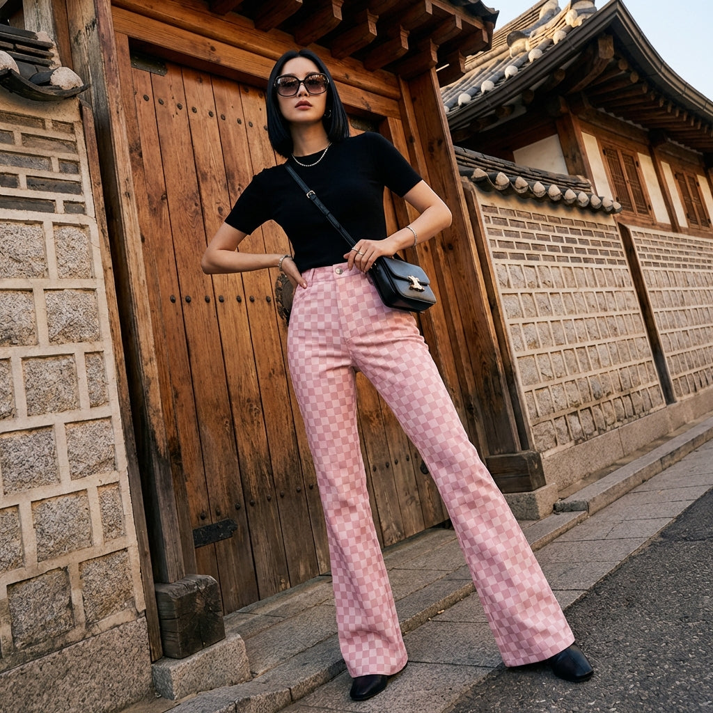 Betonen Sie Ihren Stil mit unserer hoch taillierten Schlaghose, einem trendigen Stück mit rosa Karomuster, das Ihre Silhouette verlängert. Perfekt für einen lässig-schicken Look, inspiriert von koreanischer Mode! 💖