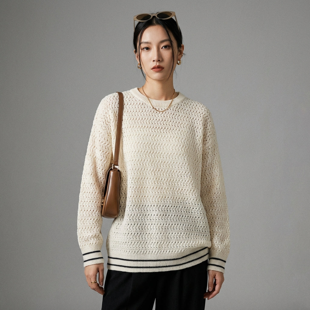 Kreieren Sie einen lässigen und doch raffinierten Look mit unserem Rundhals-Strickpullover. Sein durchbrochenes Design verleiht ihm einen Hauch von Originalität, perfekt für einen eleganten und bequemen Stil zu jeder Jahreszeit! ✨