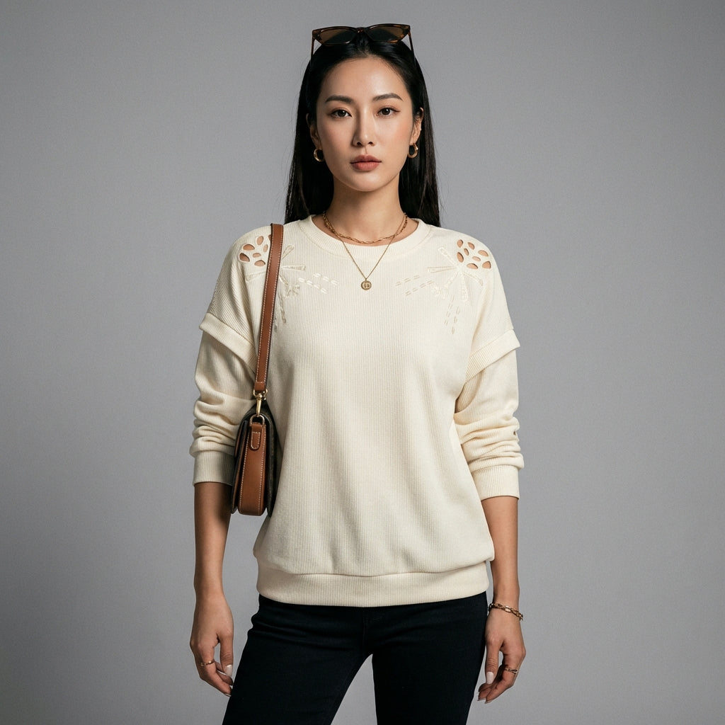 Kreieren Sie einen lässigen und stilvollen Look mit unserem Rundhals-Langarm-Sweatshirt. Sein einzigartiges Design mit subtilen Ausschnitten verleiht diesem zeitlosen Klassiker einen Hauch von Originalität. Perfekt für Ihre entspannten Tage oder Ausflüge mit Freunden! ✨