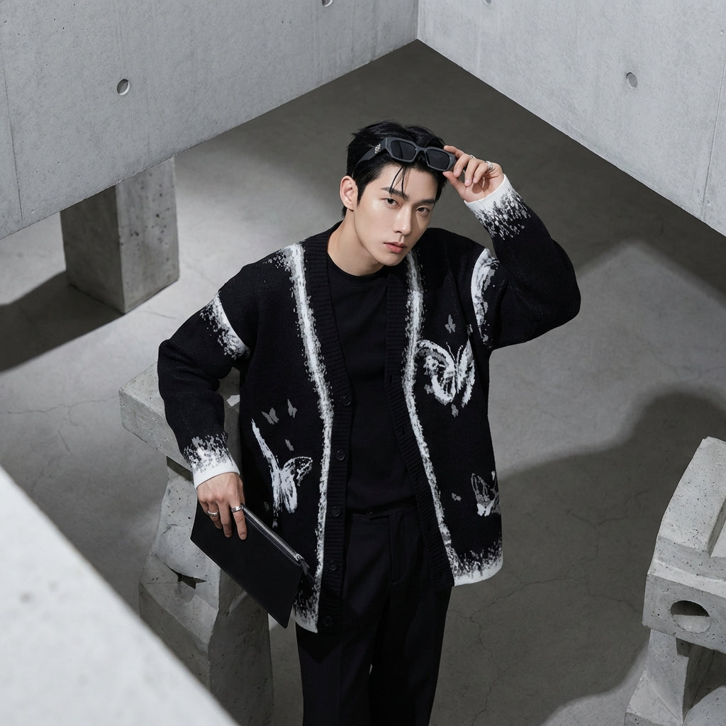 Kreieren Sie einen lässigen und trendigen Look mit unserem Strickcardigan, perfekt, um Ihren Alltagsoutfits einen Hauch von Stil zu verleihen. Sein zartes Jacquardmuster in Schmetterlingsform und sein lockerer Schnitt machen ihn zu einem bequemen und eleganten Kleidungsstück! 🦋