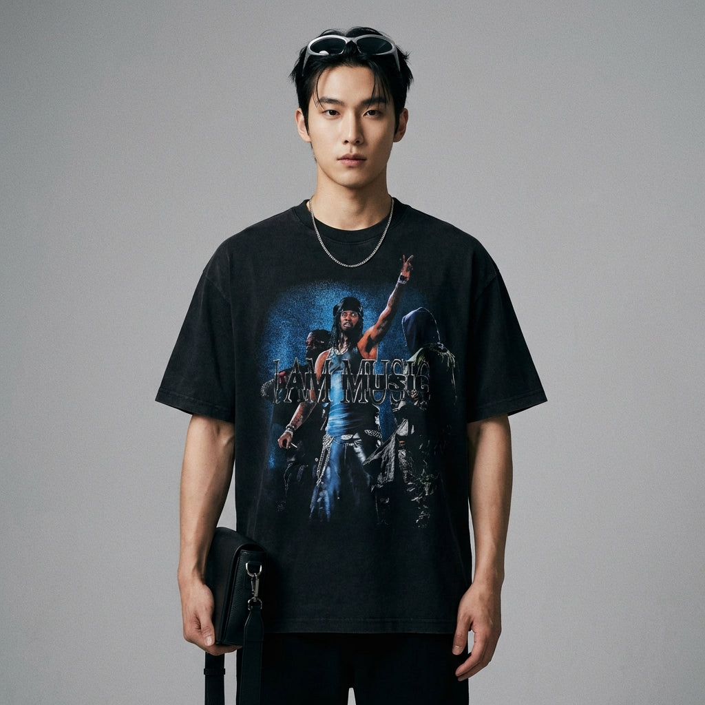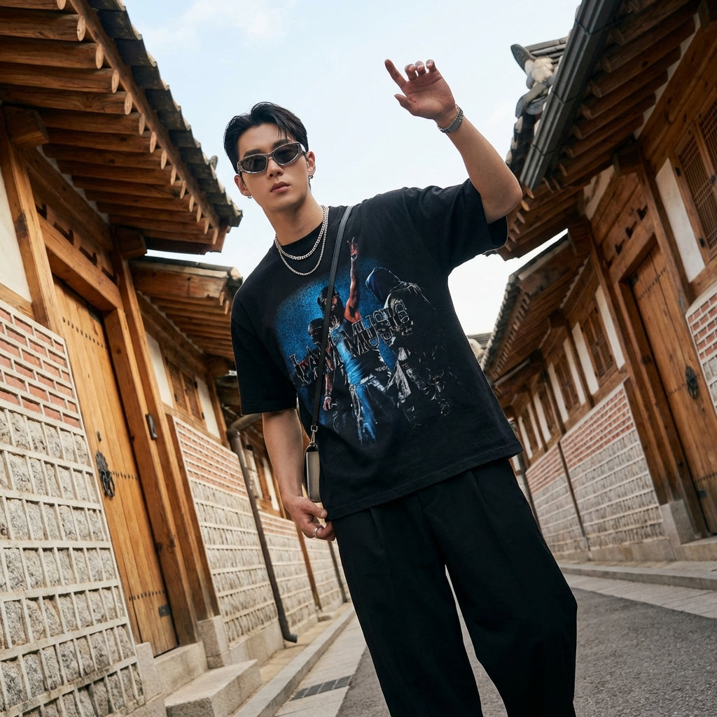 - Stil: Streetwear, Hip Hop, Trend. Dieses T-Shirt verkörpert den Geist der koreanischen Urban Fashion, ideal für einen lässigen und selbstbewussten Look.