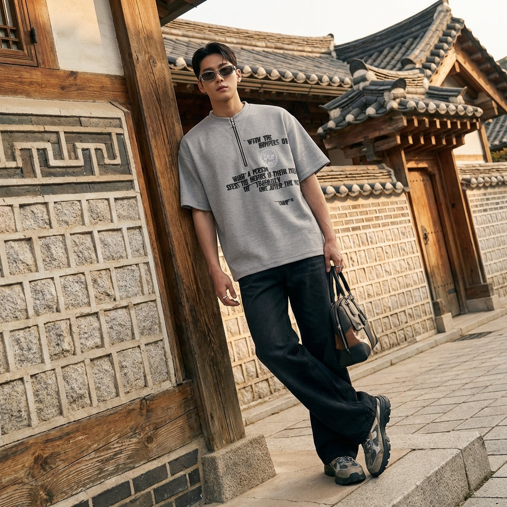 - Stil: Streetwear, Urban, Trendig. Dieses T-Shirt spiegelt die lässige und angesagte Ästhetik der Streetwear wider, mit einem Hauch koreanischer Mode.