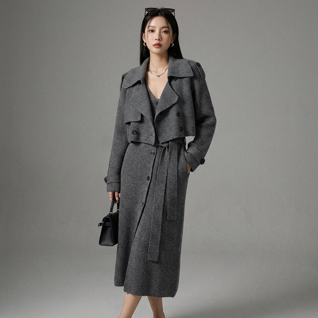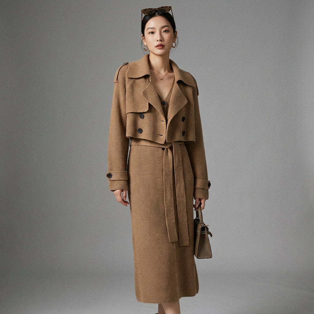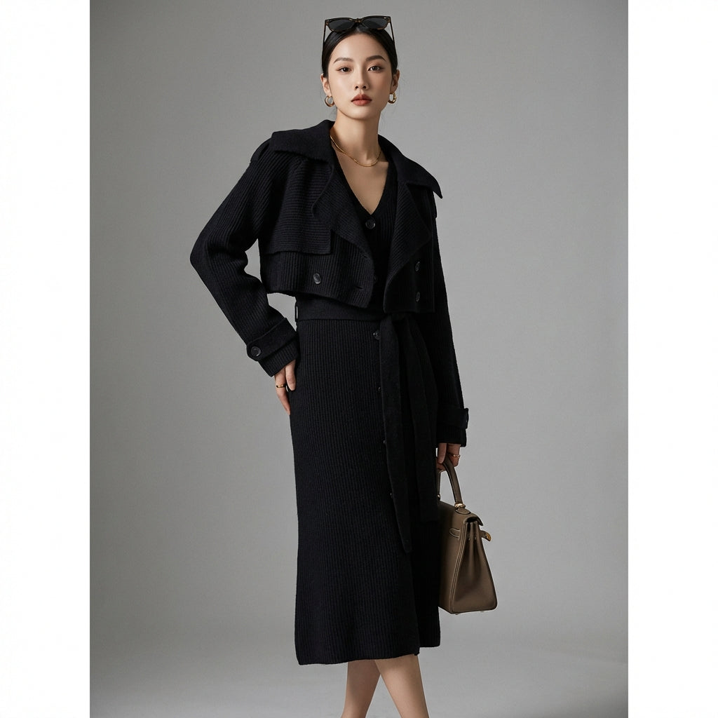 Entdecken Sie lässige Eleganz mit unserem Strick-Set, bestehend aus einem Cardigan mit Revers und einem geraden Maxikleid. Ideal für einen raffinierten und bequemen Look zu jedem Anlass! ✨