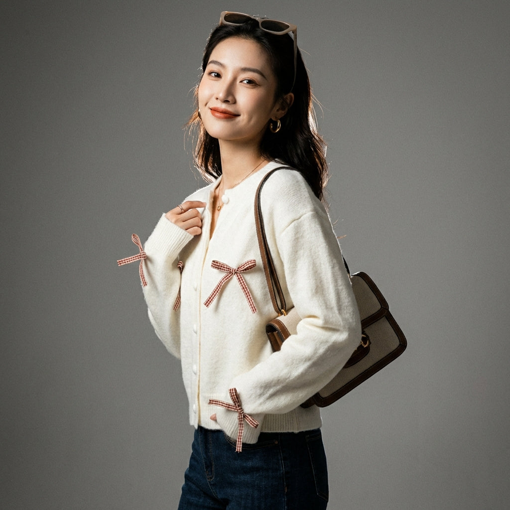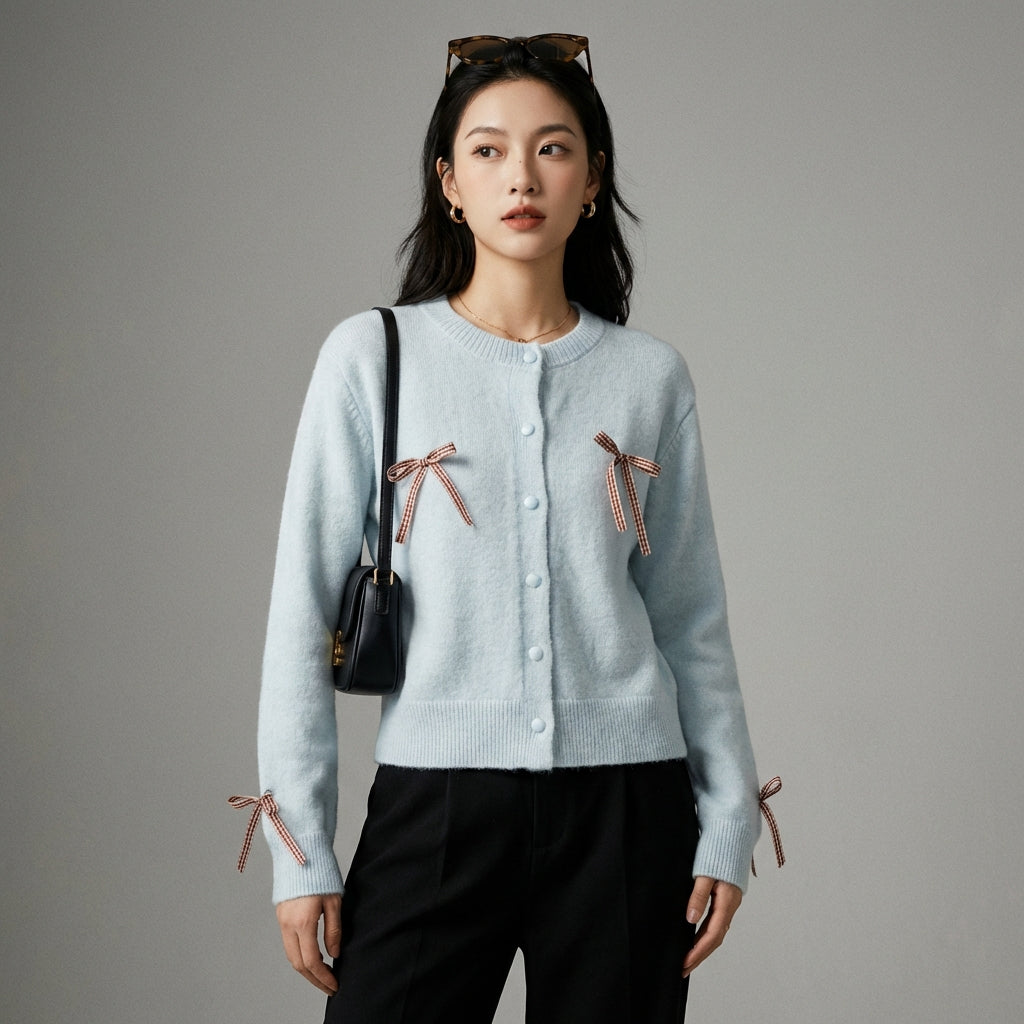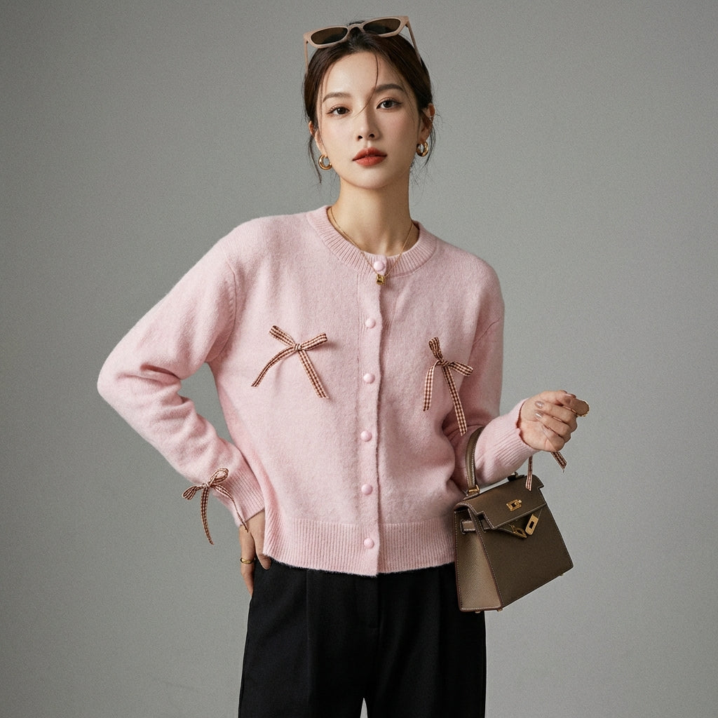 Kreieren Sie einen sanften und raffinierten Look mit unserem Strickcardigan, der durch charmante Schleifendetails veredelt wird. Dieser elegante und bequeme Pullover ist perfekt, um all Ihren Outfits einen Hauch von Raffinesse zu verleihen! 🎀