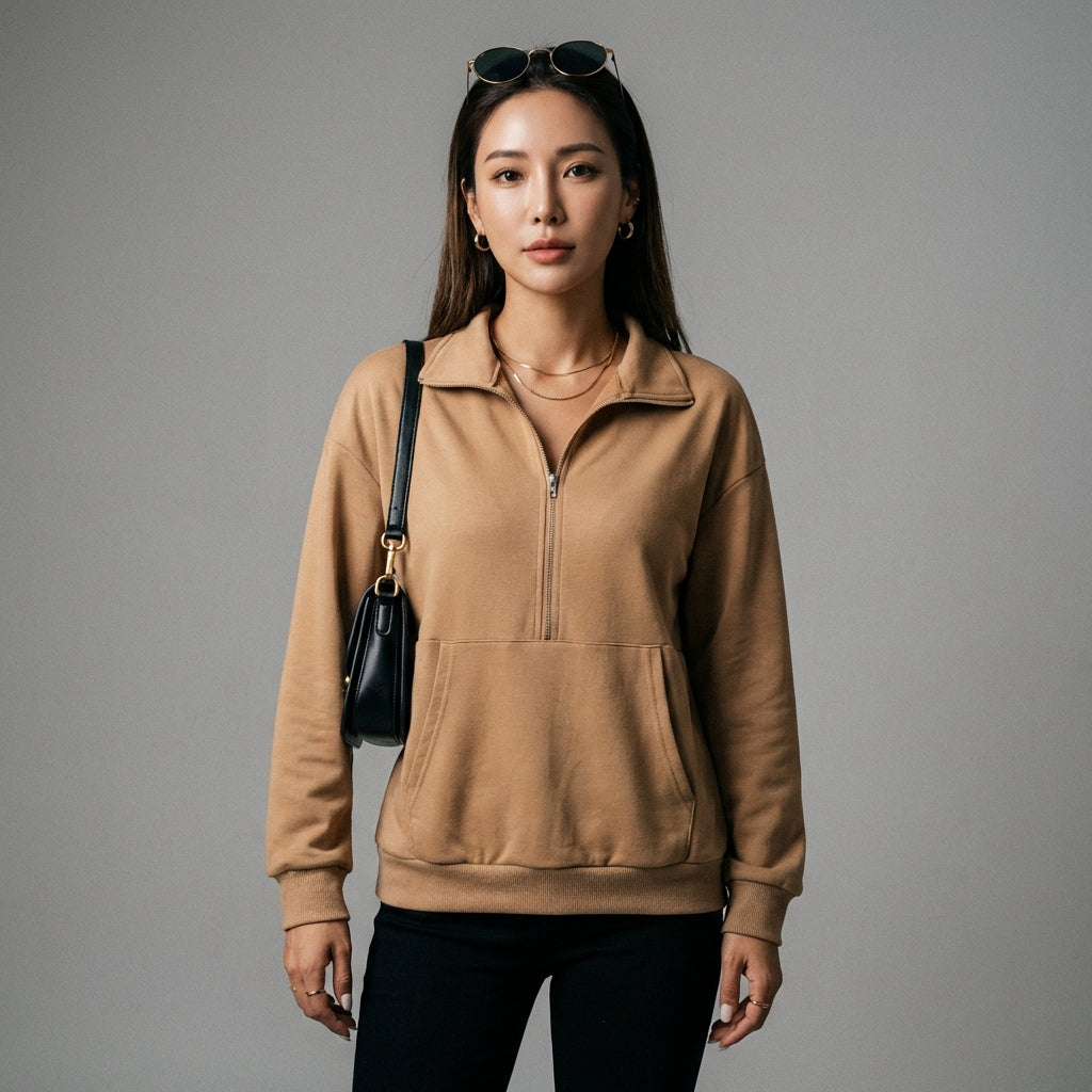 Kreieren Sie einen lässigen und trendigen Look mit unserem Sweatshirt mit Reverskragen und Reißverschluss. Ausgestattet mit praktischen Taschen, kombiniert es Stil und Funktionalität für Ihre Alltagsoutfits. Perfekt für einen modernen und bequemen Auftritt! ✨