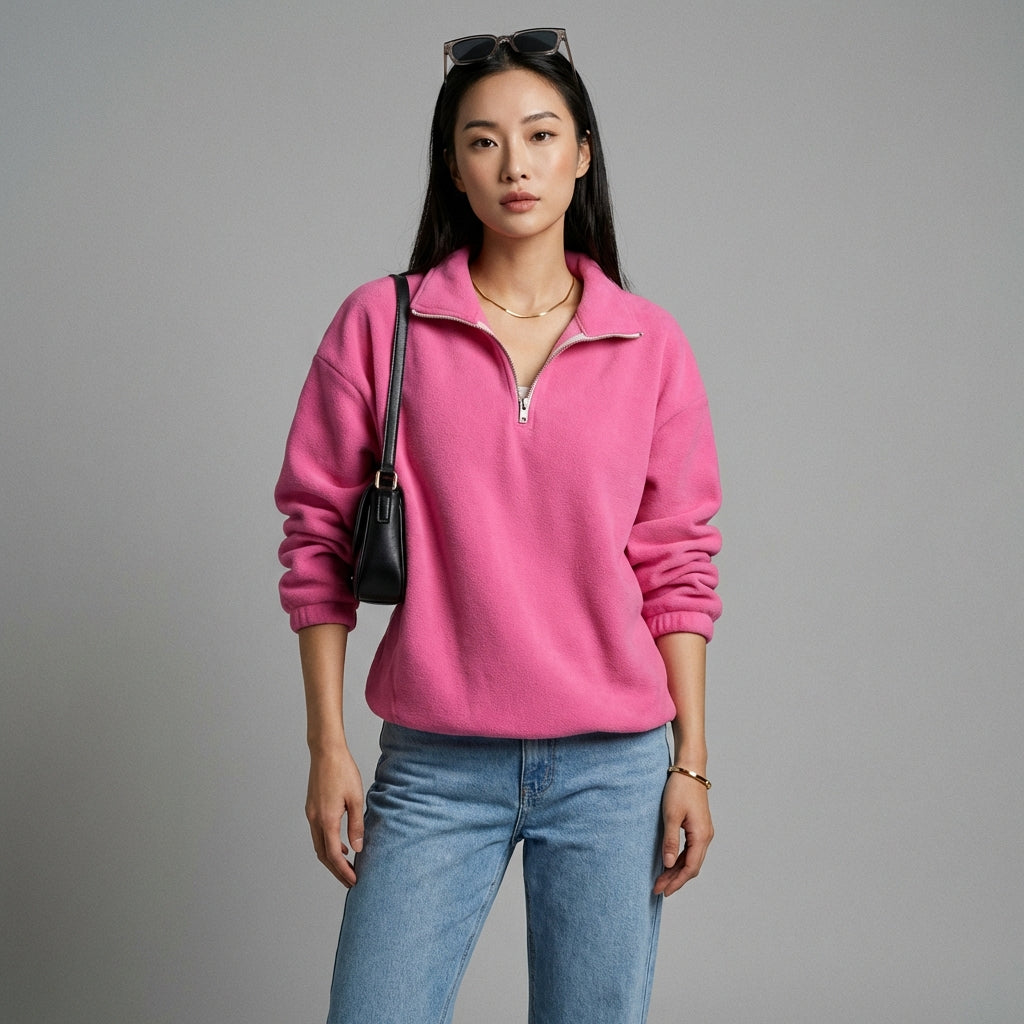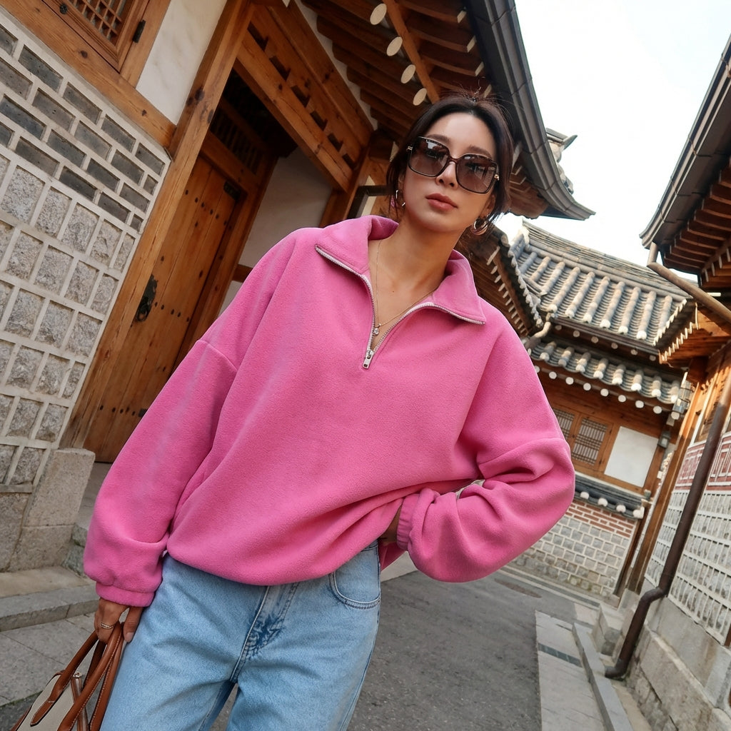 - Typ: Oversize, Halber Reißverschluss. Sein lockerer Schnitt sorgt für optimalen Komfort und Bewegungsfreiheit, während der halbe Reißverschluss die Anpassung des Kragens nach Belieben ermöglicht.