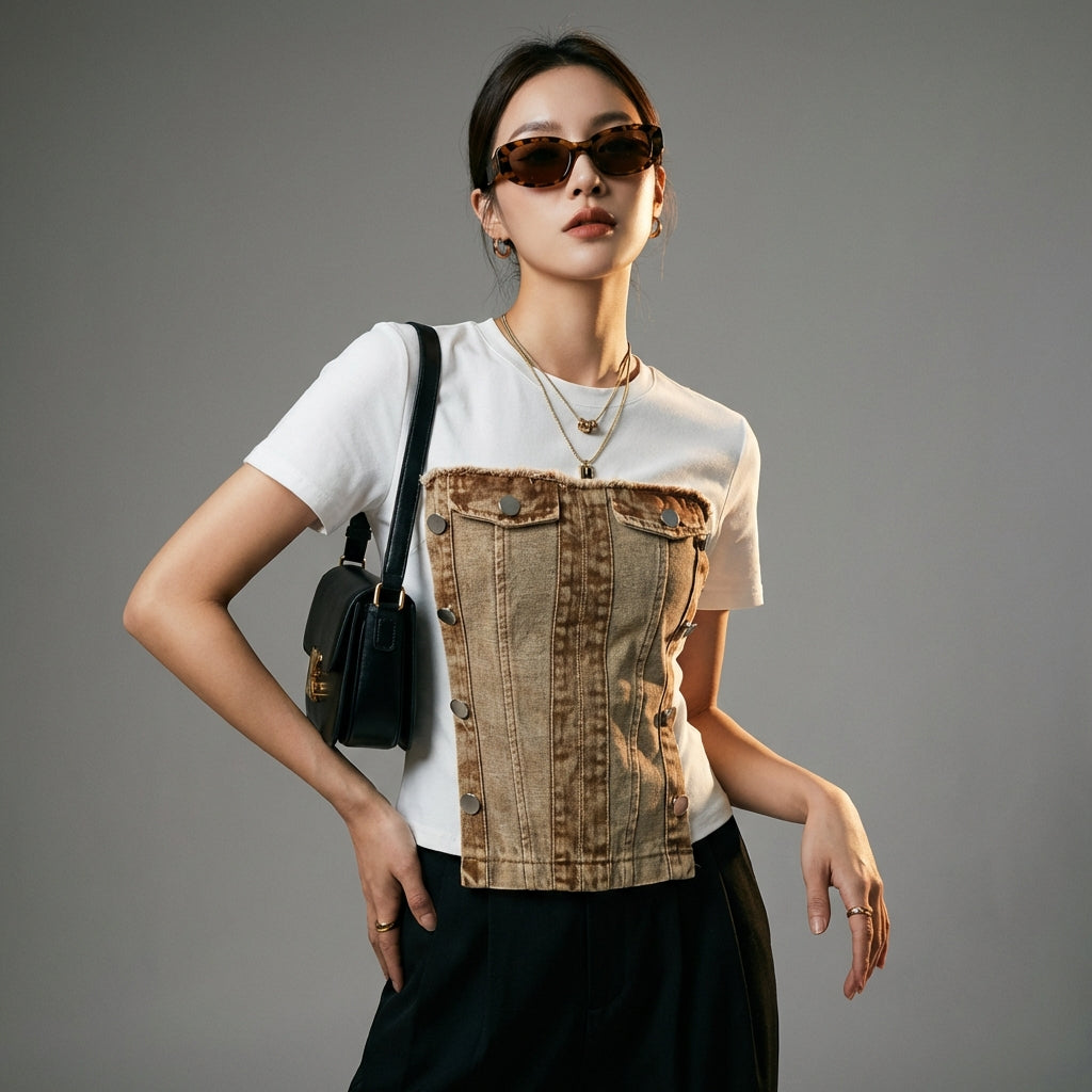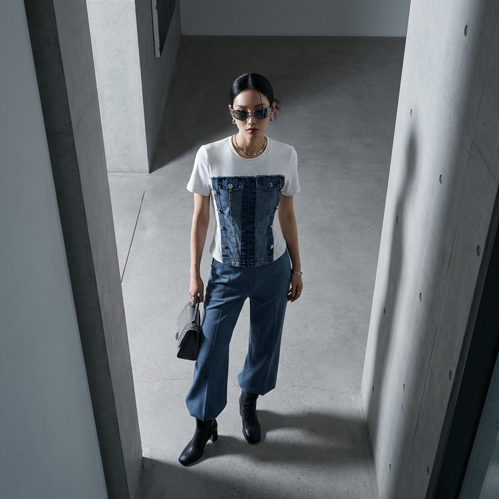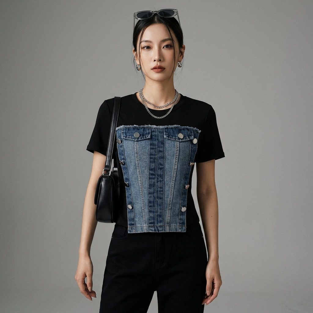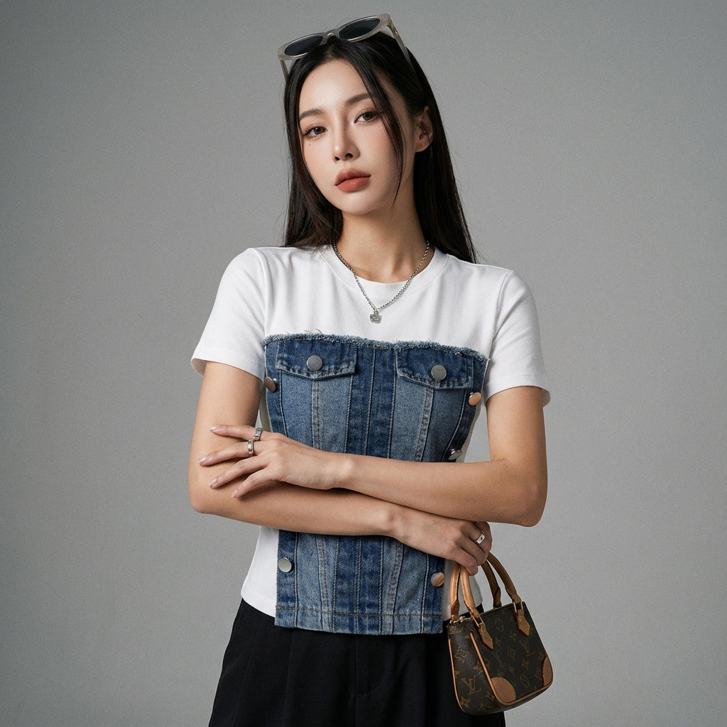 Kreieren Sie einen trendigen und lässigen Look mit unserem zweiteiligen T-Shirt in Denim-Optik. Sein figurbetonter Schnitt und sein raffiniertes Design schaffen eine moderne und stilvolle Silhouette, perfekt für all Ihre Sommerausflüge! ☀️