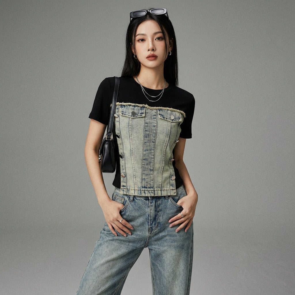 Dieses zweiteilige T-Shirt in Denim-Optik ist das Must-have für einen selbstbewussten und bequemen Stil. Es lässt sich leicht mit einer High-Waist-Jeans oder einem Rock kombinieren für ein schickes und lässiges Outfit.