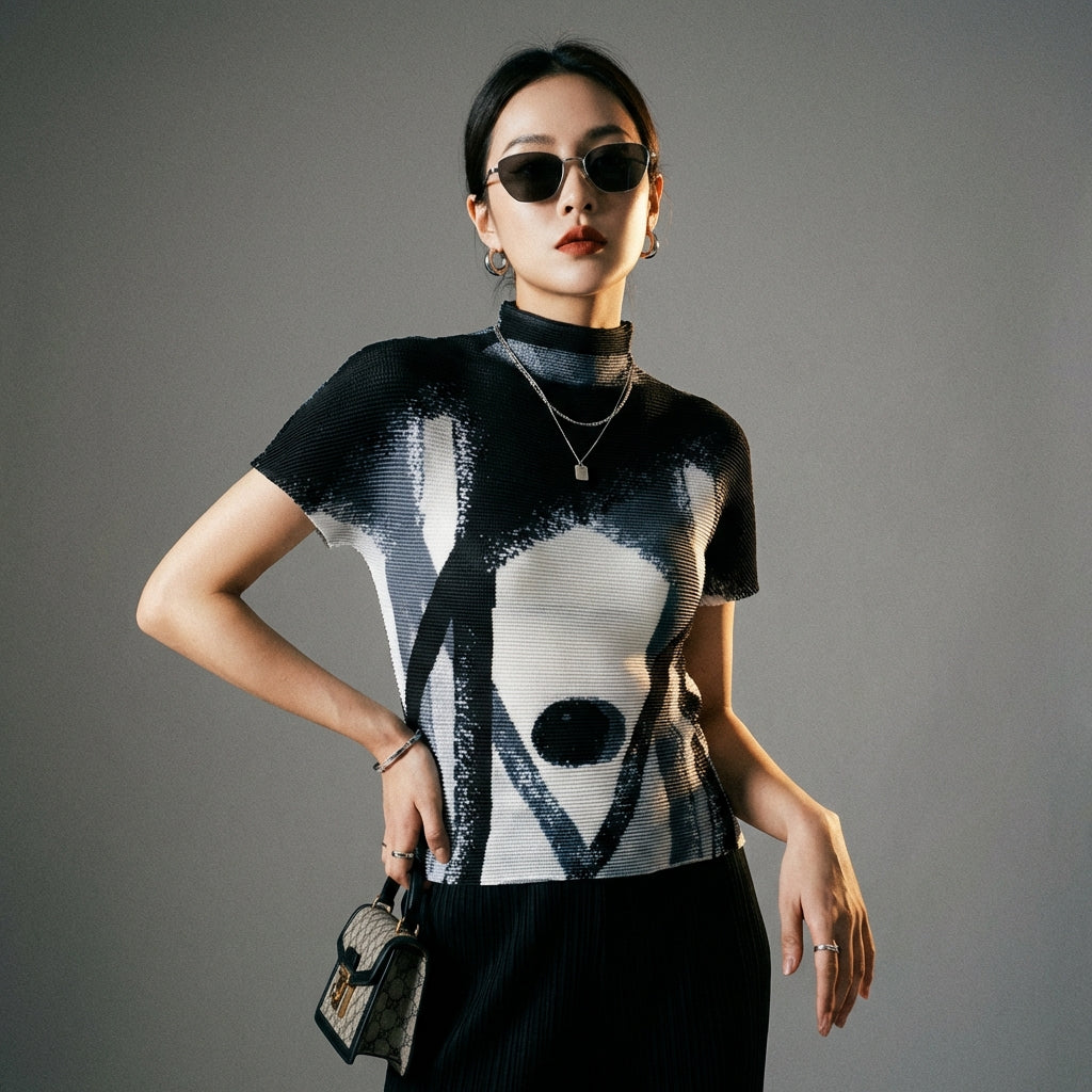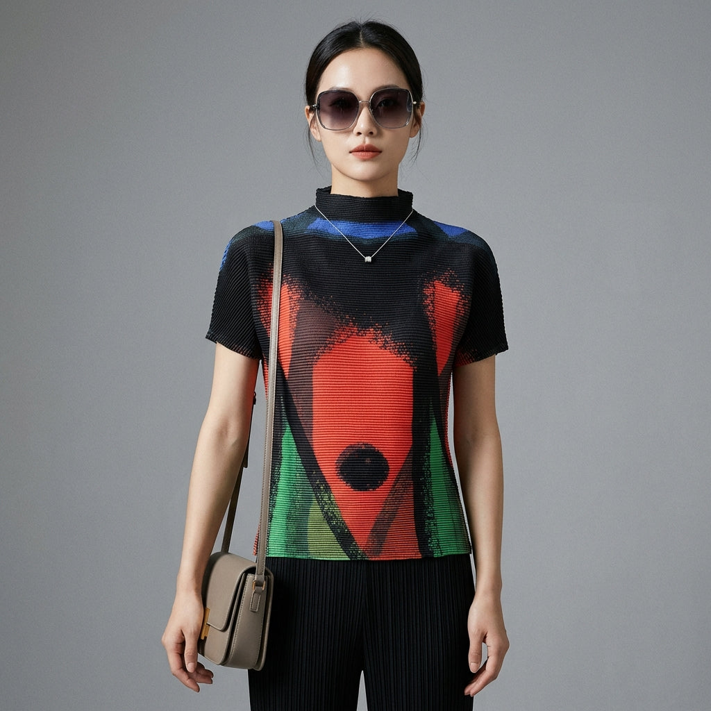 Betonen Sie Ihren Stil mit unserem kurzärmeligen T-Shirt mit Stehkragen, veredelt durch einen gewagten geometrischen Druck. Sein figurbetonter Schnitt bringt Ihre Silhouette zur Geltung, perfekt für einen sommerlichen und trendigen Look! ☀️