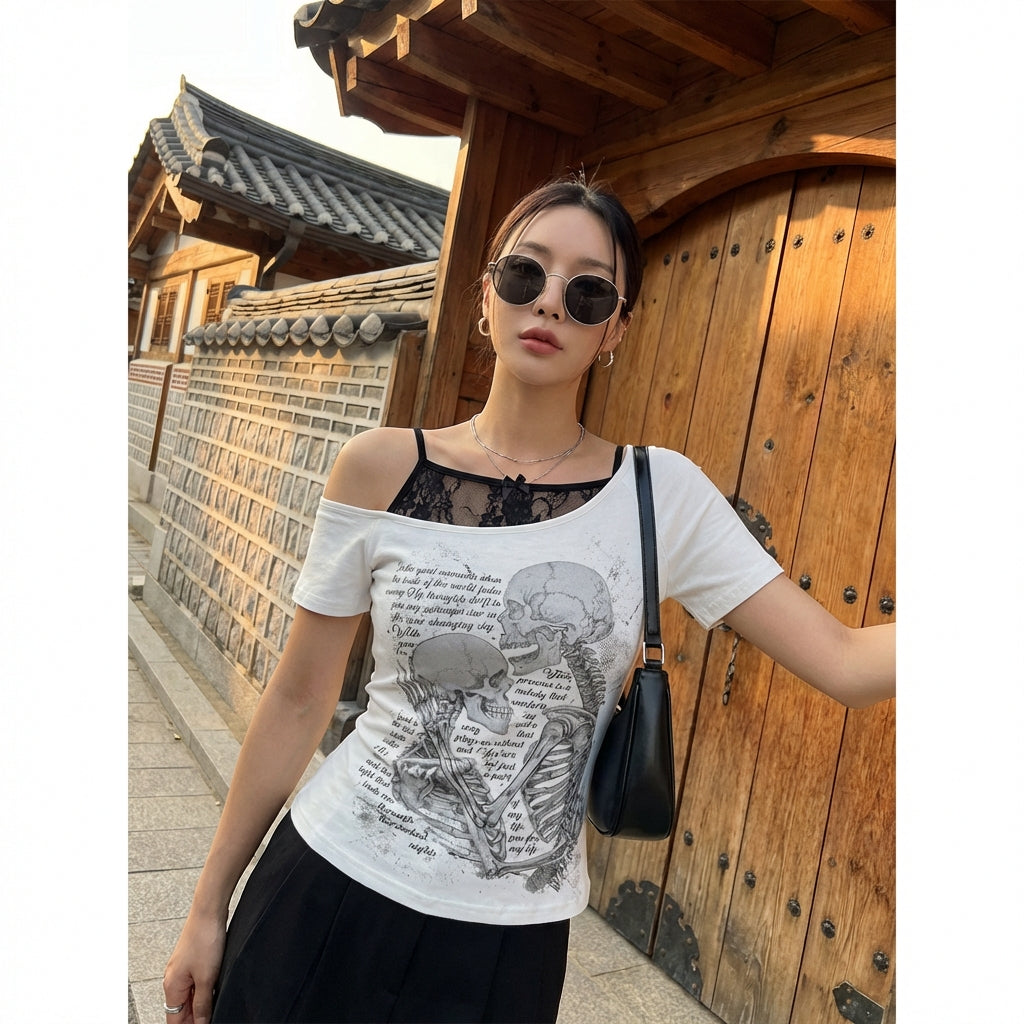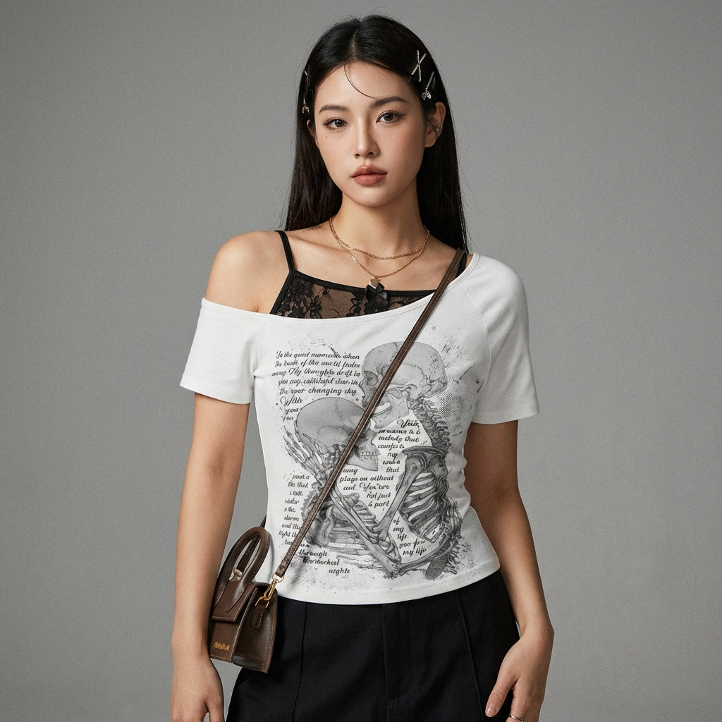 Betonen Sie Ihren Stil mit diesem einzigartigen T-Shirt mit Totenkopf-Print, das mit einem "Zweiteiler"-Effekt und schulterfreien Ärmeln für einen gewagten und trendigen Look entworfen wurde. Perfekt für alle, die gerne auffallen! 💀