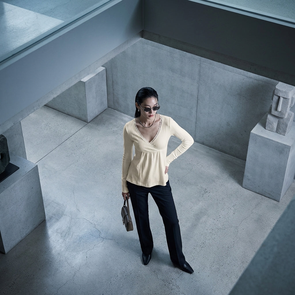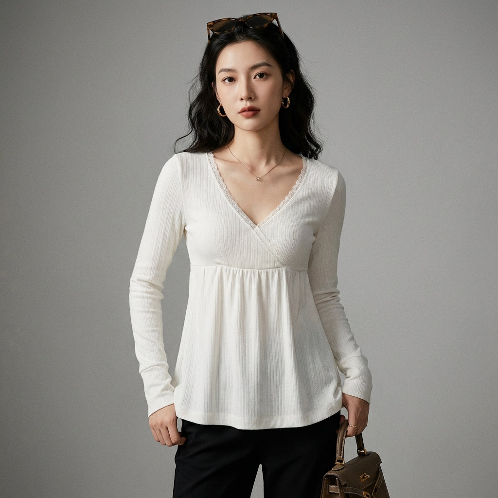 Verleihen Sie sich einen raffinierten Look mit diesem langärmeligen T-Shirt, das einen eleganten V-Ausschnitt und zarte Spitzendetails aufweist. Ideal für einen schicken und raffinierten Alltagslook! ✨