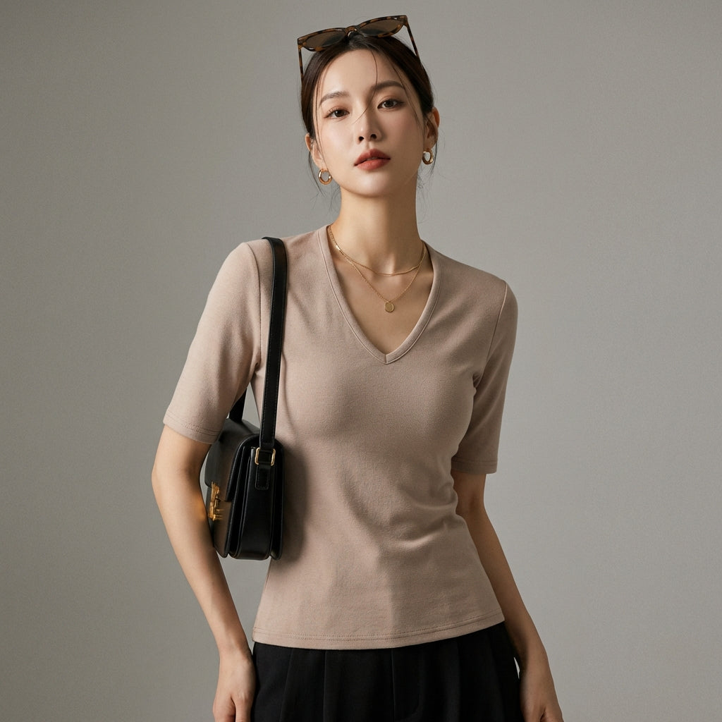 Setzen Sie auf einen schicken und klaren Look mit unserem figurbetonten V-Ausschnitt-T-Shirt mit kurzen Ärmeln. Ideal, um Ihre Figur zu betonen, kombiniert es Stil und Komfort für all Ihre Anlässe! ✨