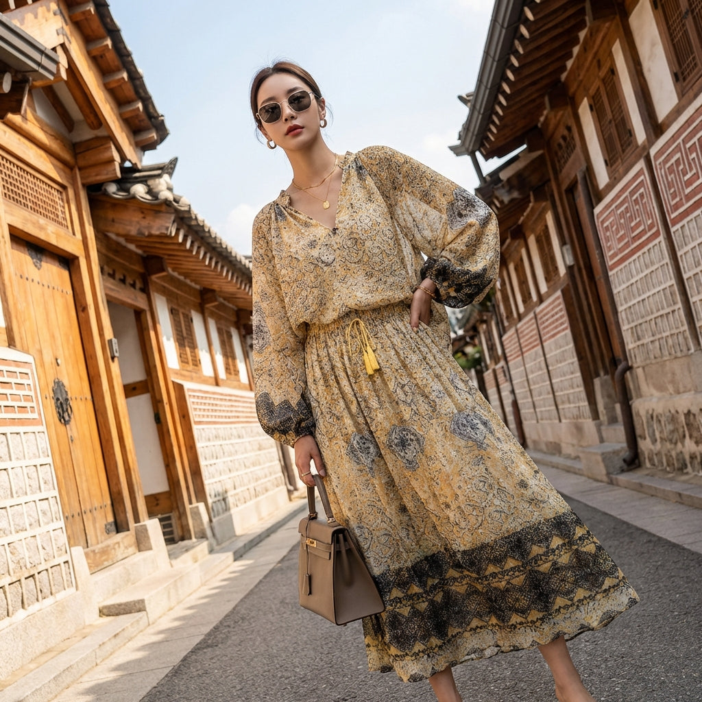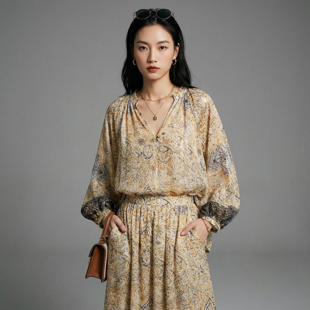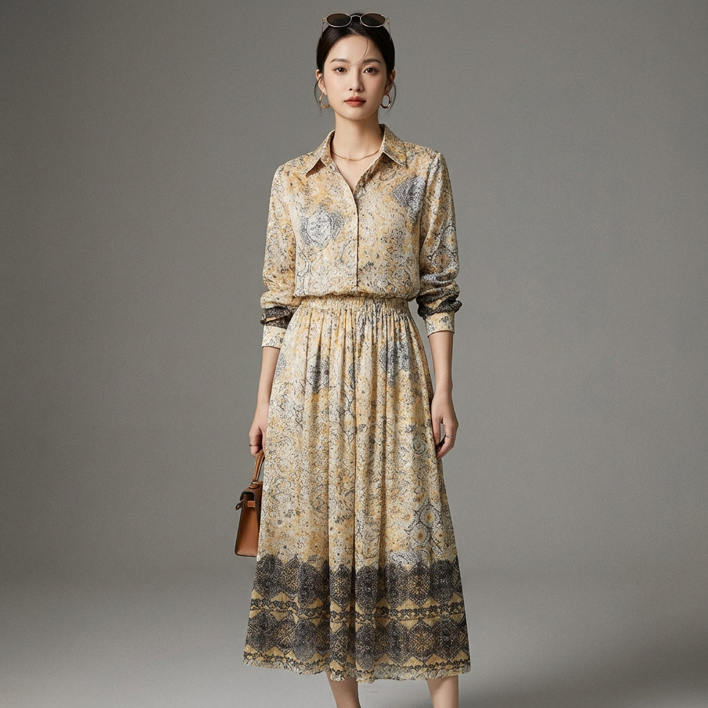 - Typ: Freizeit-Set, langes Hemd, Midirock. Ein Schnitt, der auf Flüssigkeit und Bewegung ausgelegt ist und sich an verschiedene Anlässe anpasst.