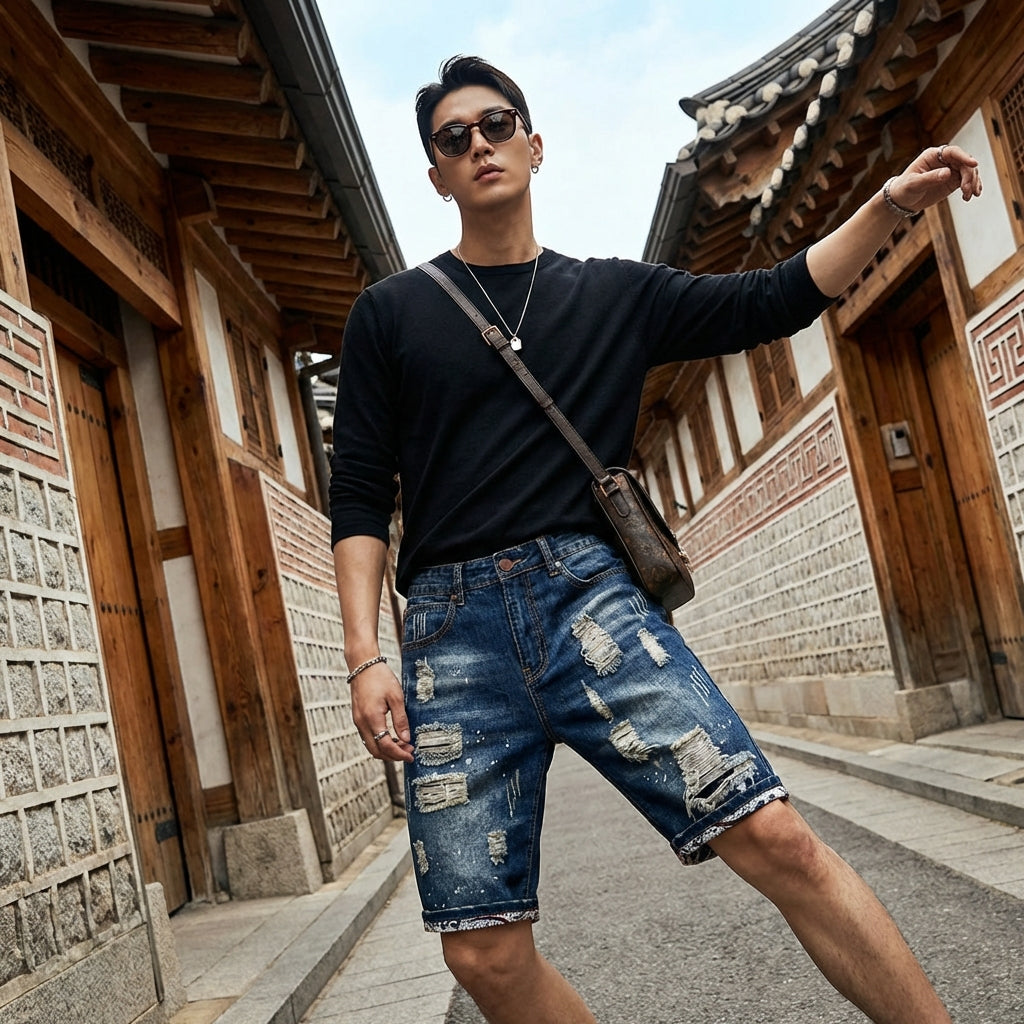 Diese Used-Denim-Shorts sind das ideale Kleidungsstück, um Ihre Sommergarderobe mit einem Hauch von Modernität und K-Fashion-Stil zu ergänzen.