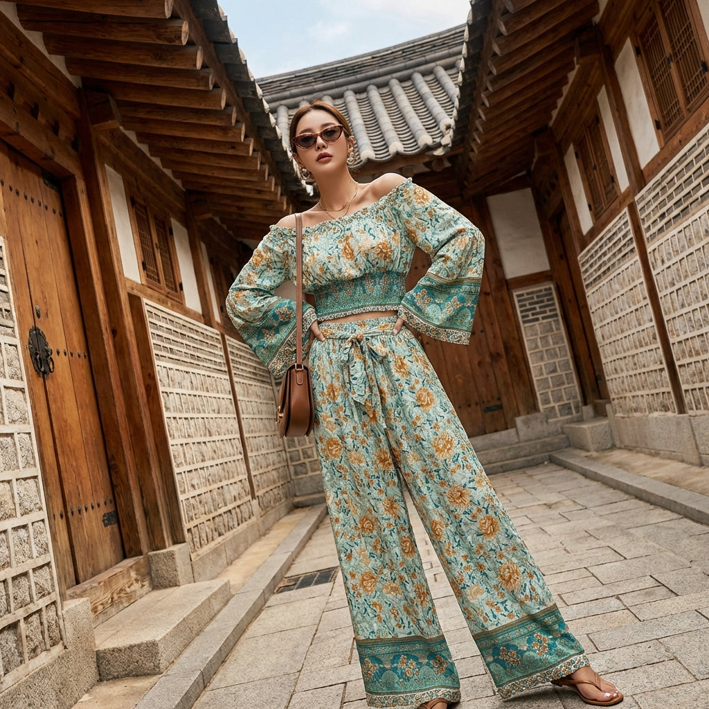 Kreieren Sie einen lässigen und schicken Look mit diesem zweiteiligen Set, perfekt für die moderne Frau. Es besteht aus einem langärmeligen Oberteil aus Baumwolle mit Vintage-Print und einer hoch taillierten Hose mit weitem Bein aus Viskose, die Komfort und Eleganz für all Ihre Anlässe bietet! 🌸