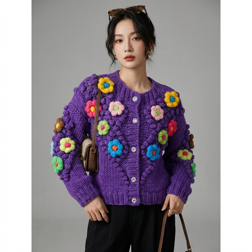 Kreieren Sie einen sanften und femininen Look mit unserem gestrickten Wollcardigan, verziert mit zarten Blumen. Sein Rundhalsausschnitt und die langen Ärmel machen ihn zu einem perfekten Kleidungsstück, um bei jeder Gelegenheit elegant und bequem zu bleiben! 🌸