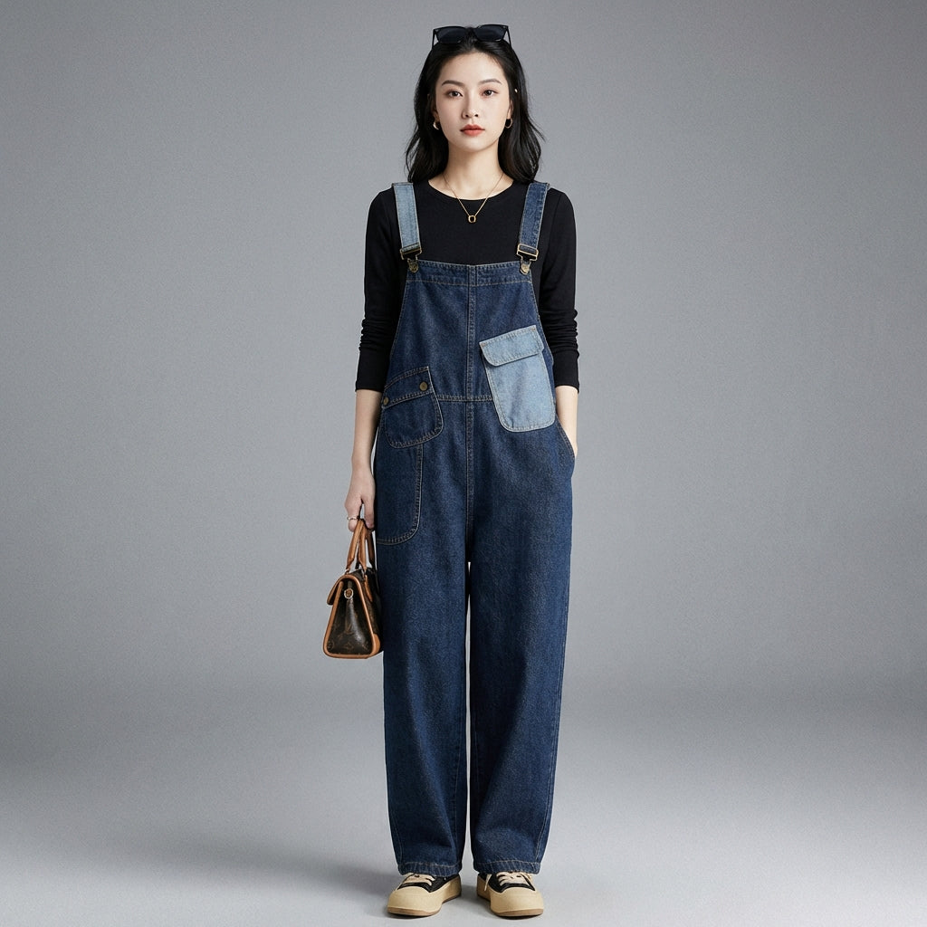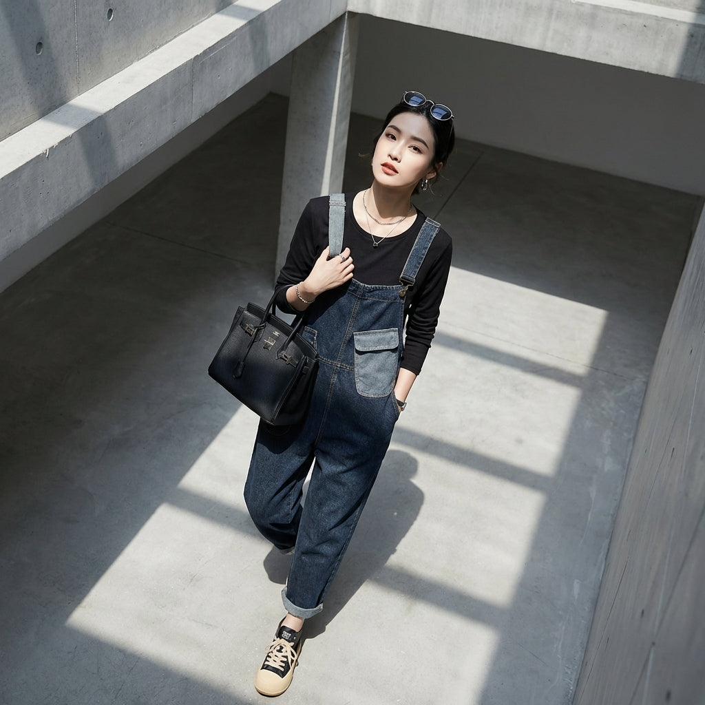 Mit dieser Jeans-Latzhose wählen Sie ein Schlüsselstück für eine moderne Garderobe, das Leichtigkeit und Stil mit koreanischem Modeeinfluss vereint.