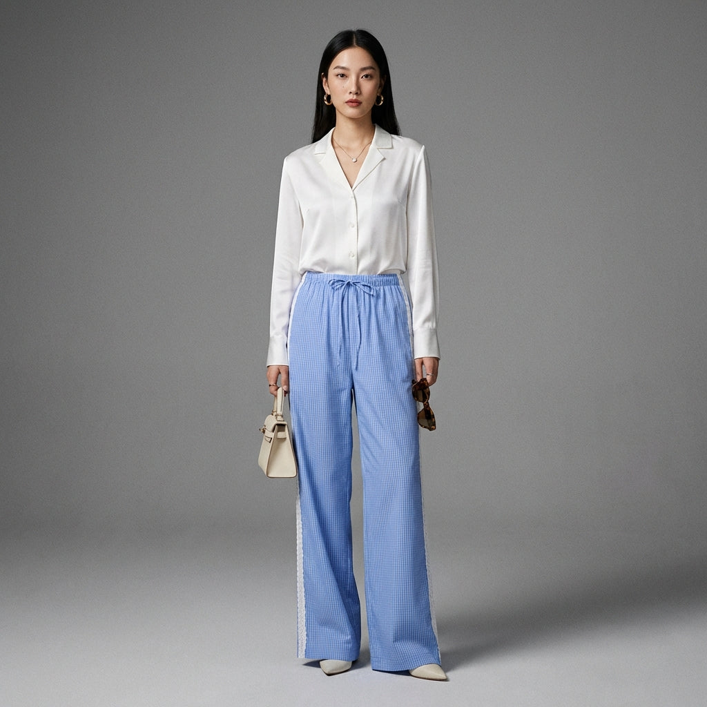 Kreieren Sie einen lässigen und schicken Look mit unserer weiten Hose mit elastischem Bund, verziert mit zarten blauen Spitzeneinsätzen. Entworfen für Komfort und Stil, wird sie Sie perfekt im Alltag begleiten! 💙