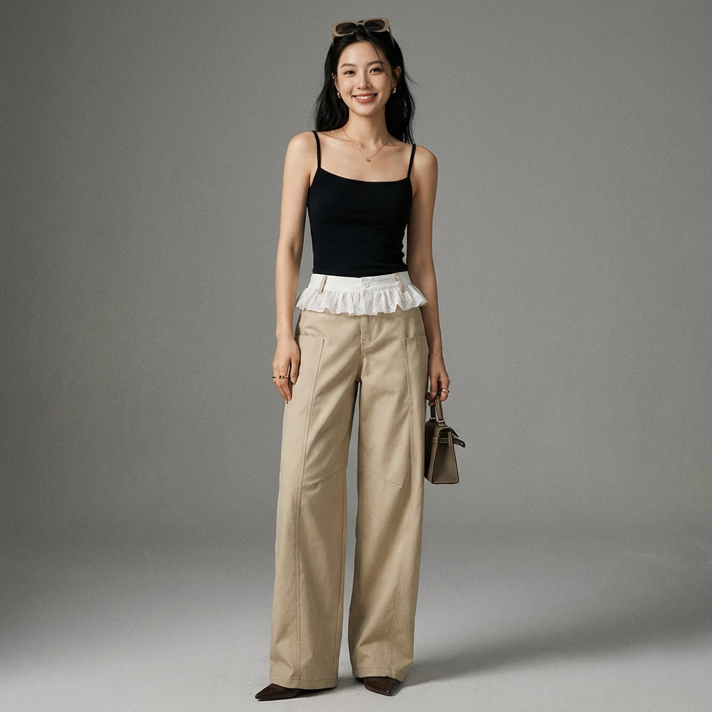 Kreieren Sie einen trendigen und raffinierten Look mit unserer weiten Hose mit hoher Taille, verziert mit Spitzendetails. Ideal für einen lässig-eleganten Auftritt oder einen selbstbewussten Streetwear-Stil! ✨