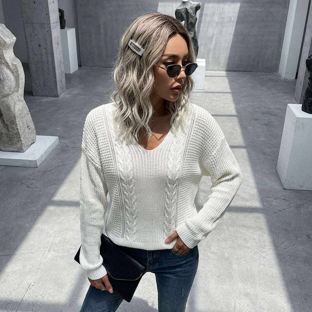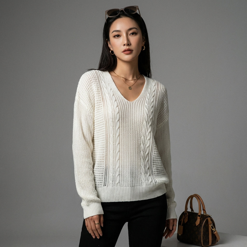 Kreieren Sie einen lässigen und eleganten Look mit unserem Zopfstrickpullover. Sein lockeres Design und der V-Ausschnitt machen ihn zu einem bequemen und trendigen Kleidungsstück, perfekt für alle Gelegenheiten! 🌟