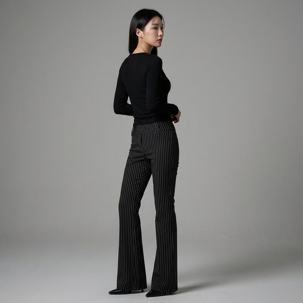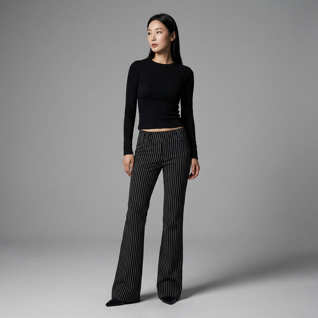 - Typ: Schlaghose, niedriger Bund. Der ausgestellte Schnitt und der niedrige Bund strecken die Silhouette und verleihen einen retro-schicken Touch.